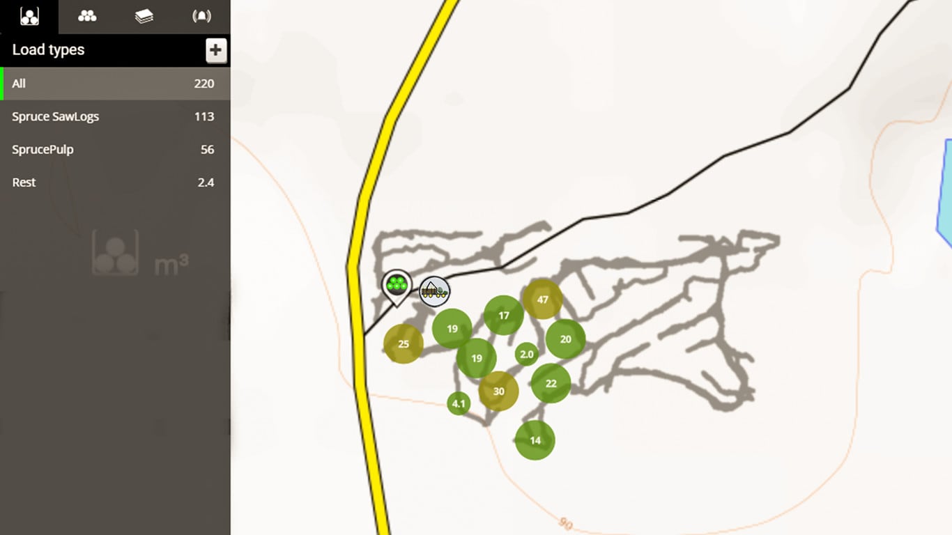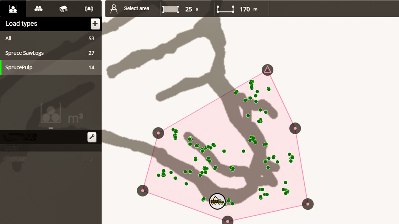 O operador do Forwarder pode escolher o sortimento desejado de uma área específica ou ao longo de uma rota de toras, e o mapa mostrará o volume exato daquele sortimento na área escolhida. Os operadores também podem marcar áreas especiais no mapa. Desta forma, por exemplo, pode-se evitar terrenos macios ao planejar uma rota de condução.